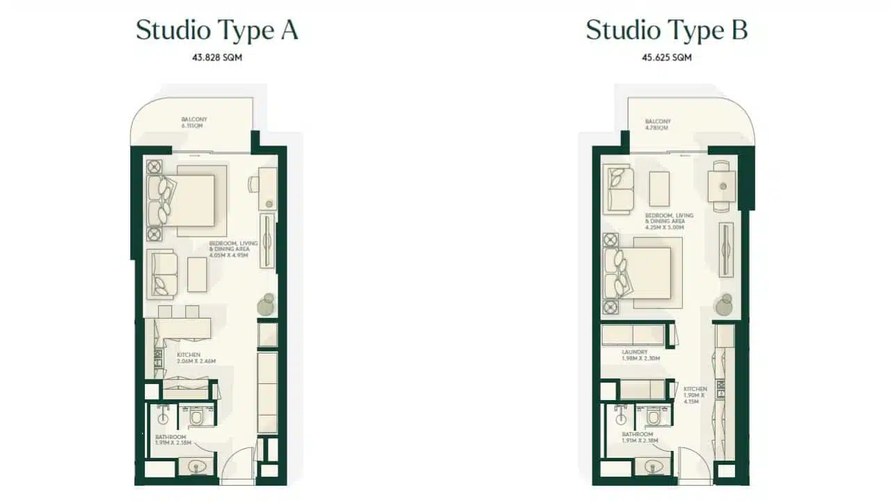 The project offers about 2,400 properties spread across several mid-rise buildings. Interested buyers can currently choose from the first 210 units, including cozy studios and stylish apartments with 1–3 bedrooms. Floor plans vary in size from 473 sq. ft to 1,938 sq. ft, and the design of the residences can be customized according to the buyers preferences in either a dark or light colour palette. All properties feature a private balcony and floor-to-ceiling windows that boast stunning views of the canal and the landscaped community area.